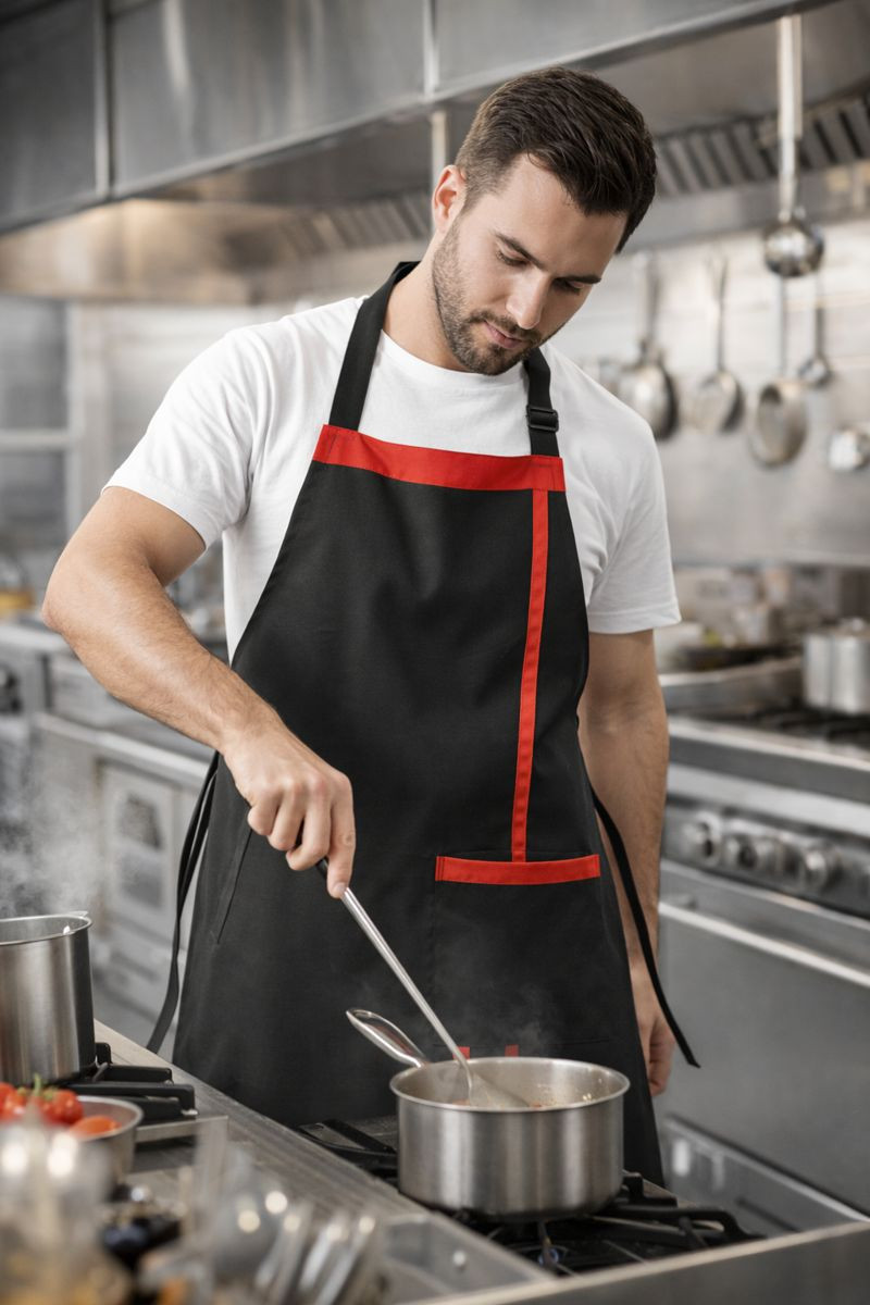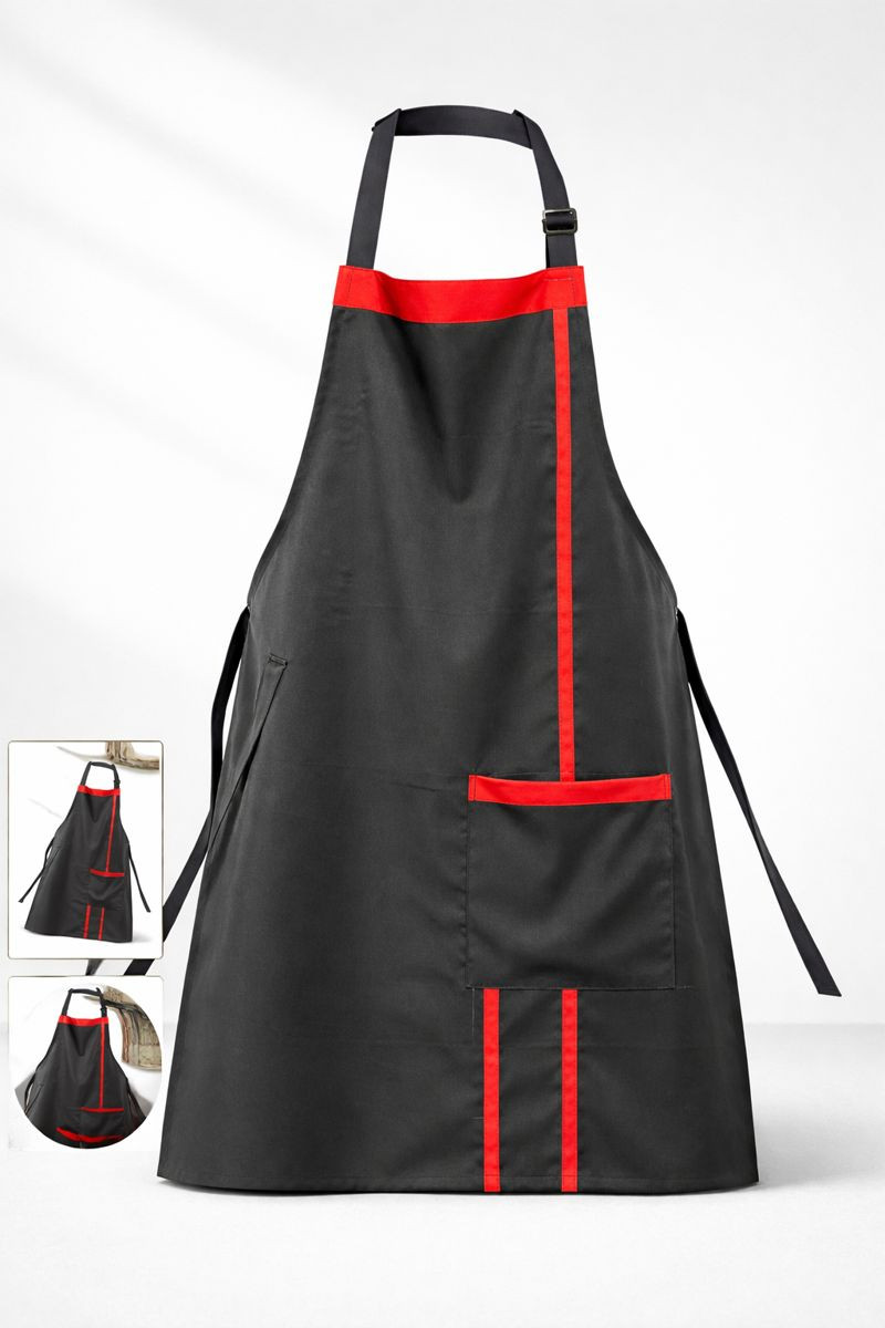Profesyonel mutfak ortamları için özel olarak tasarlanan siyah kırmızı şeritli mutfak önlüğü, hem şık görünüm hem de yüksek dayanıklılık sunar. Aşçı önlüğü, restoran, kafe, otel mutfağı ve ev kullanımı için idealdir.