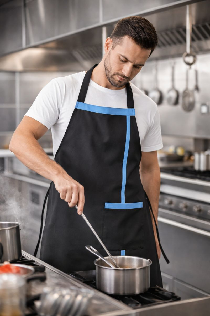 Modern ve profesyonel mutfaklar için tasarlanan mavi şeritli siyah mutfak önlüğü, şıklık ve işlevselliği bir arada sunar. Restoran, kafe, otel mutfağı ve ev kullanımı için uygun olan bu aşçı önlüğü, yoğun tempolu mutfak çalışmalarında konfor sağlar.