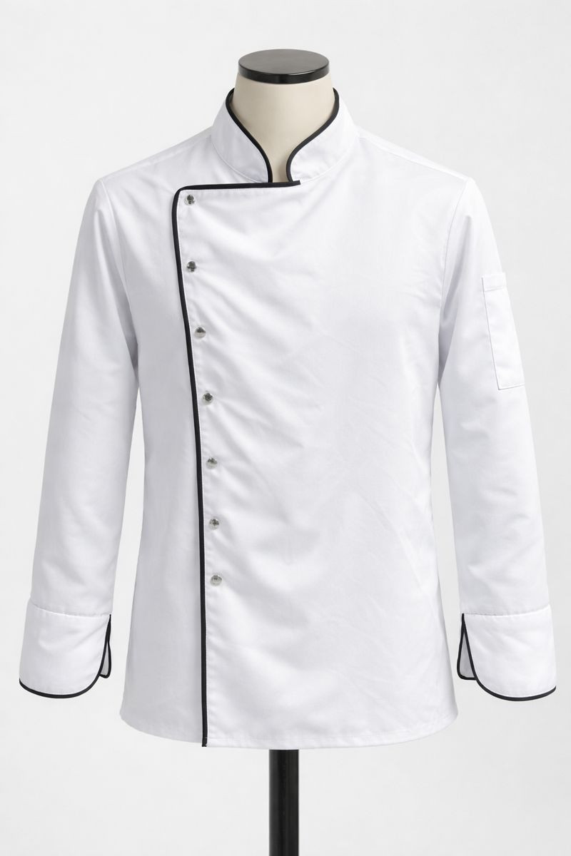 MEKAIZEN profesyonel şef forması; uzun kollu, çıtçıtlı ve siyah biyeli tasarımıyla restoran ve otel mutfakları için konforlu aşçı ceketi.
