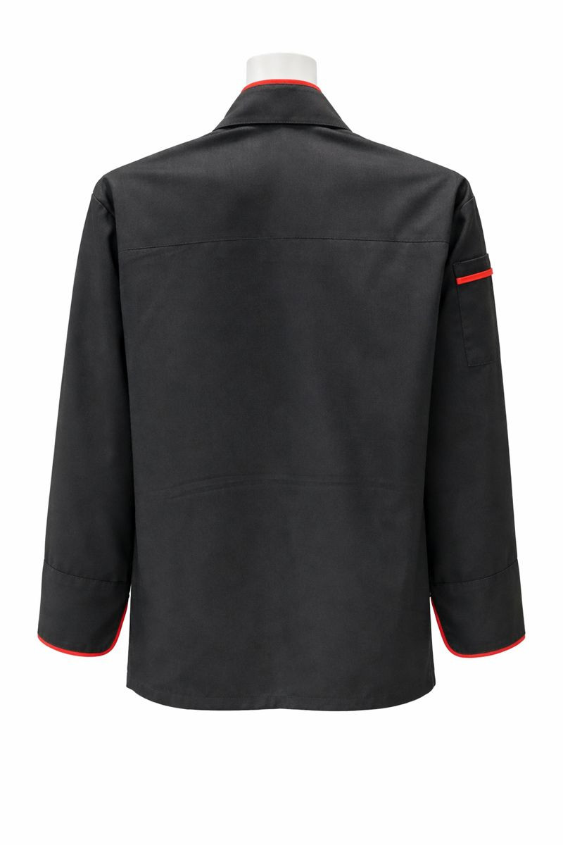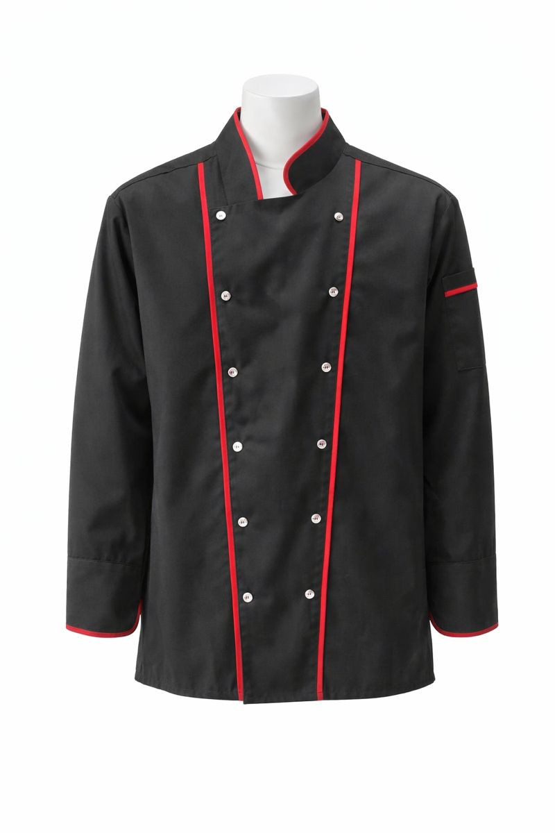 Profesyonel mutfaklar için siyah kırmızı biyeli unisex şef ceketi. Uzun kollu, dayanıklı ve şık aşçı kıyafeti modeli.